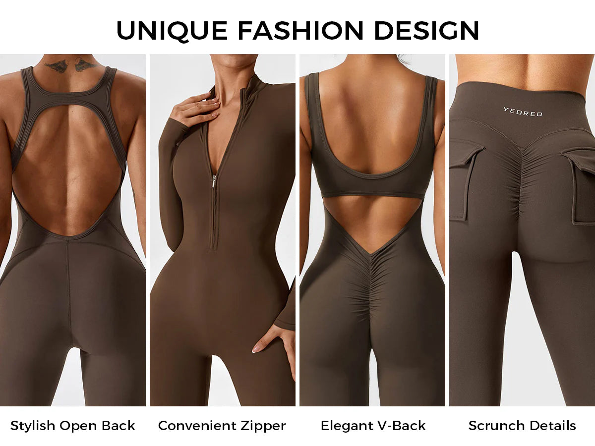 Elevate your style with our Open Back Flared Jumpsuit, featuring a retro athletic vibe. The classic flared silhouette elongates your legs, while the bold open-back adds a trendy touch. Ideal for casual outings, workouts, or yoga, it effortlessly blends fashion with elegance.